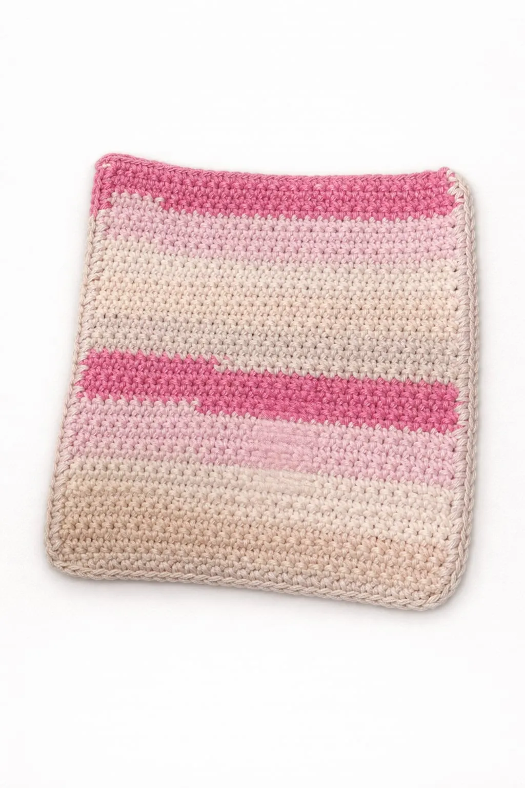 Handmade crocheted dishcloth in soft blush and cream stripes, perfect for washing dishes by hand. Made with thick, textured stitching for extra scrubbing power while still being gentle on cookware. Reusable, washable, and durable—an eco-friendly alternative to disposable sponges and paper towels. Great for everyday kitchen cleaning or as a cute handmade gift.